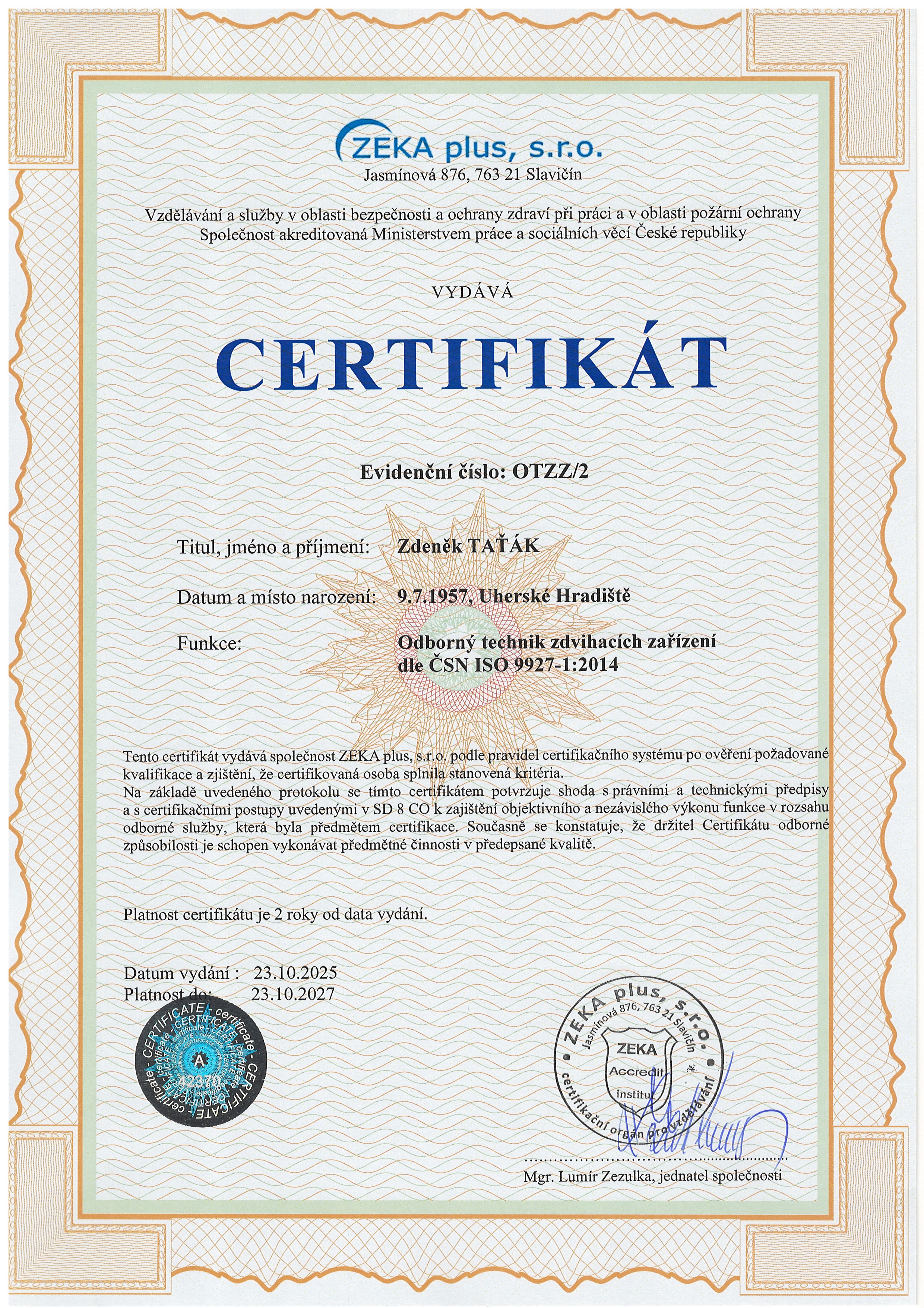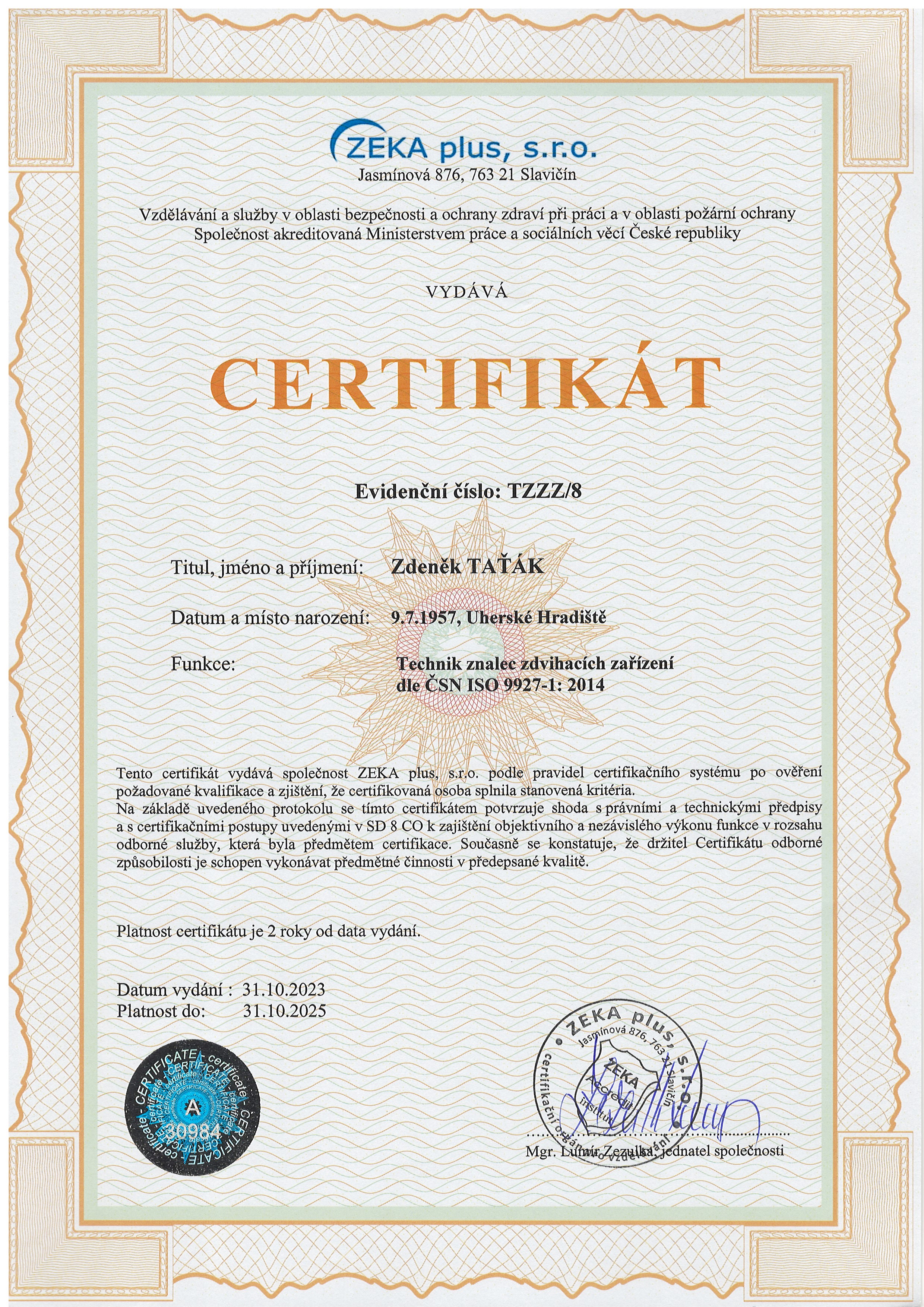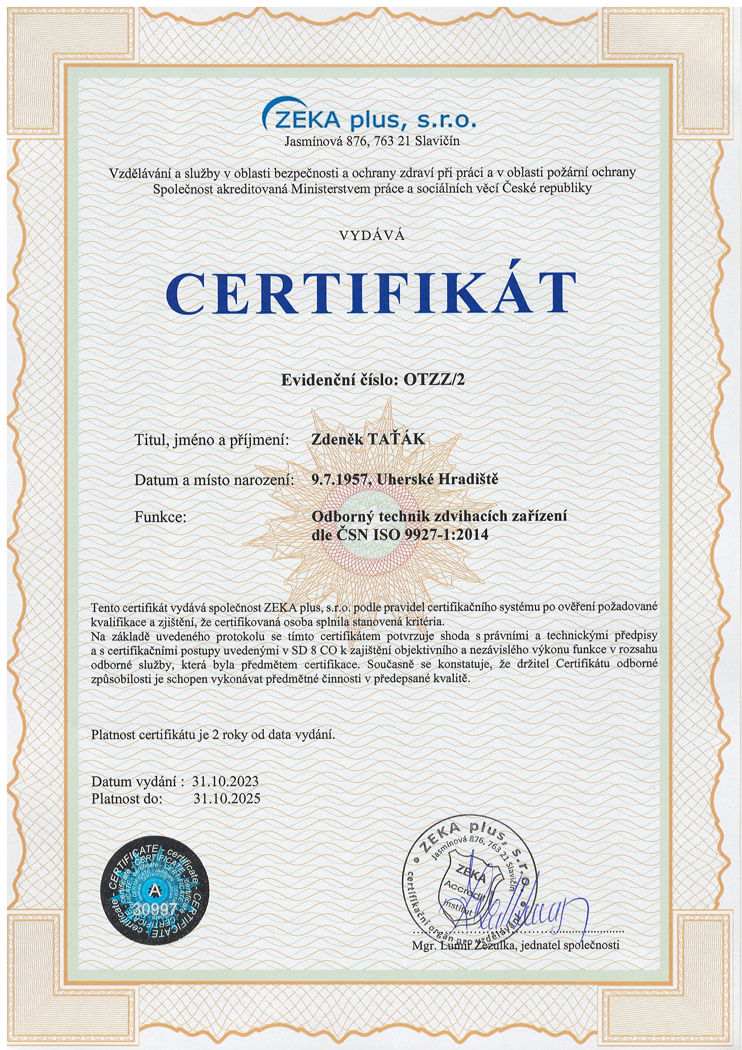 Certifikace dodavatelů + zaměstnanců/Certifikace revize ZZ, školení - Taťák/aktuální certifikáty/Certifikát pro OK 2025.jpg