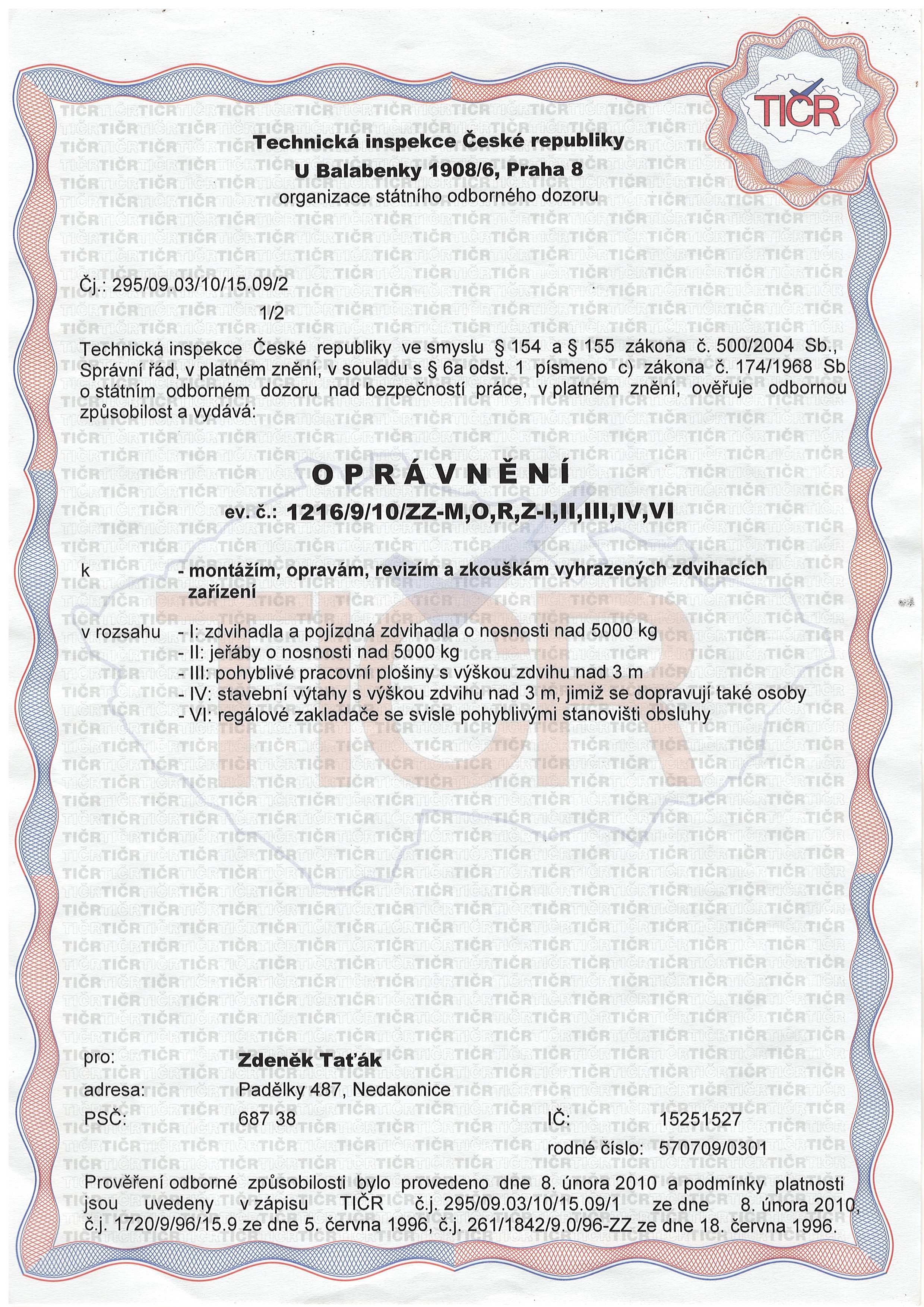 Certifikace dodavatelů + zaměstnanců/Certifikace revize ZZ, školení - Taťák/Oprávnění k montážín, revizím, atd/OPRÁVNĚNÍ k montážím, opravám, revizím a zkouškám ZZ 1. strana.jpg