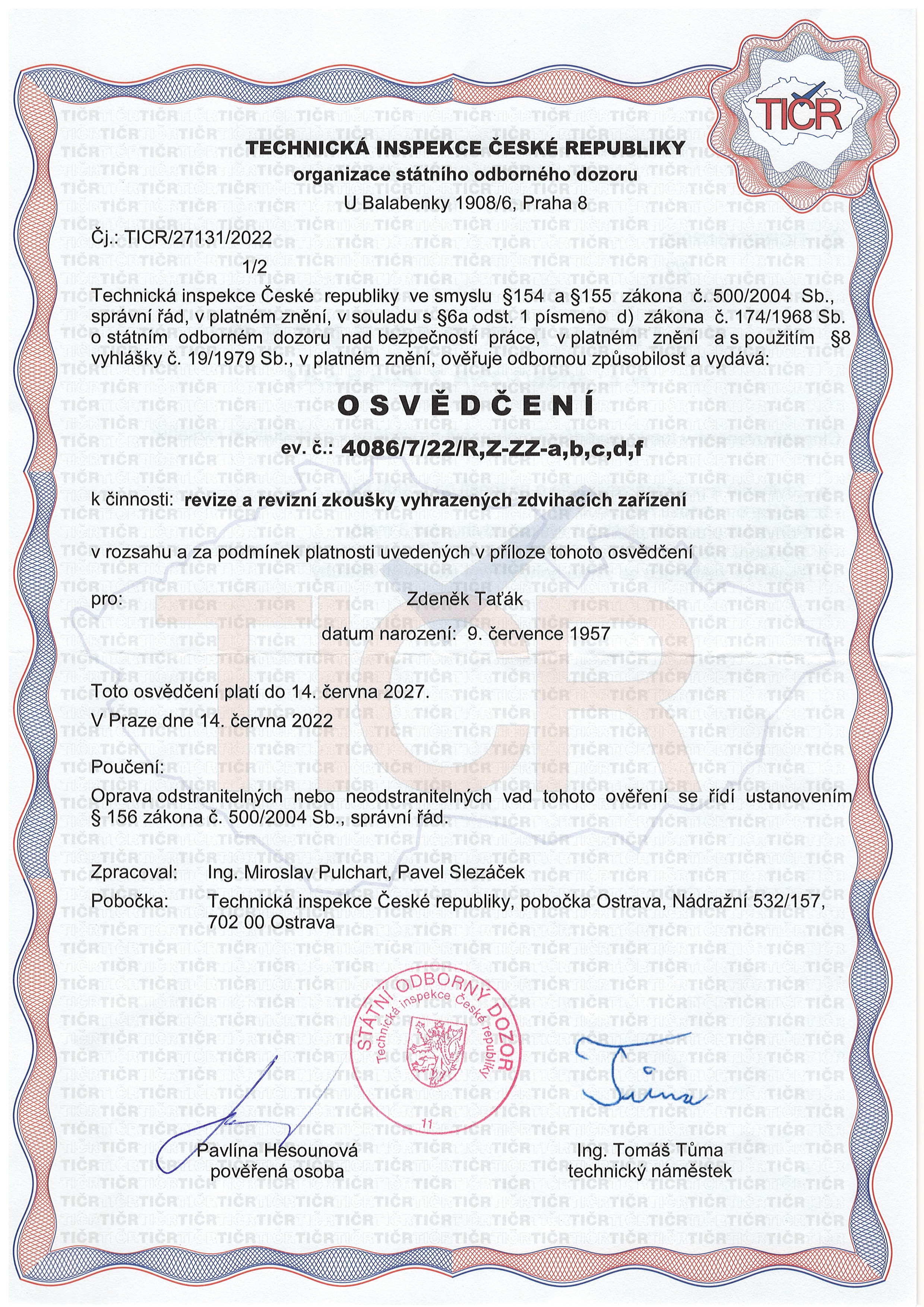 Certifikace dodavatelů + zaměstnanců/Certifikace revize ZZ, školení - Taťák/Certifikat OTZZ/CERTIFIKÁT OTZZ 1. strana.jpg