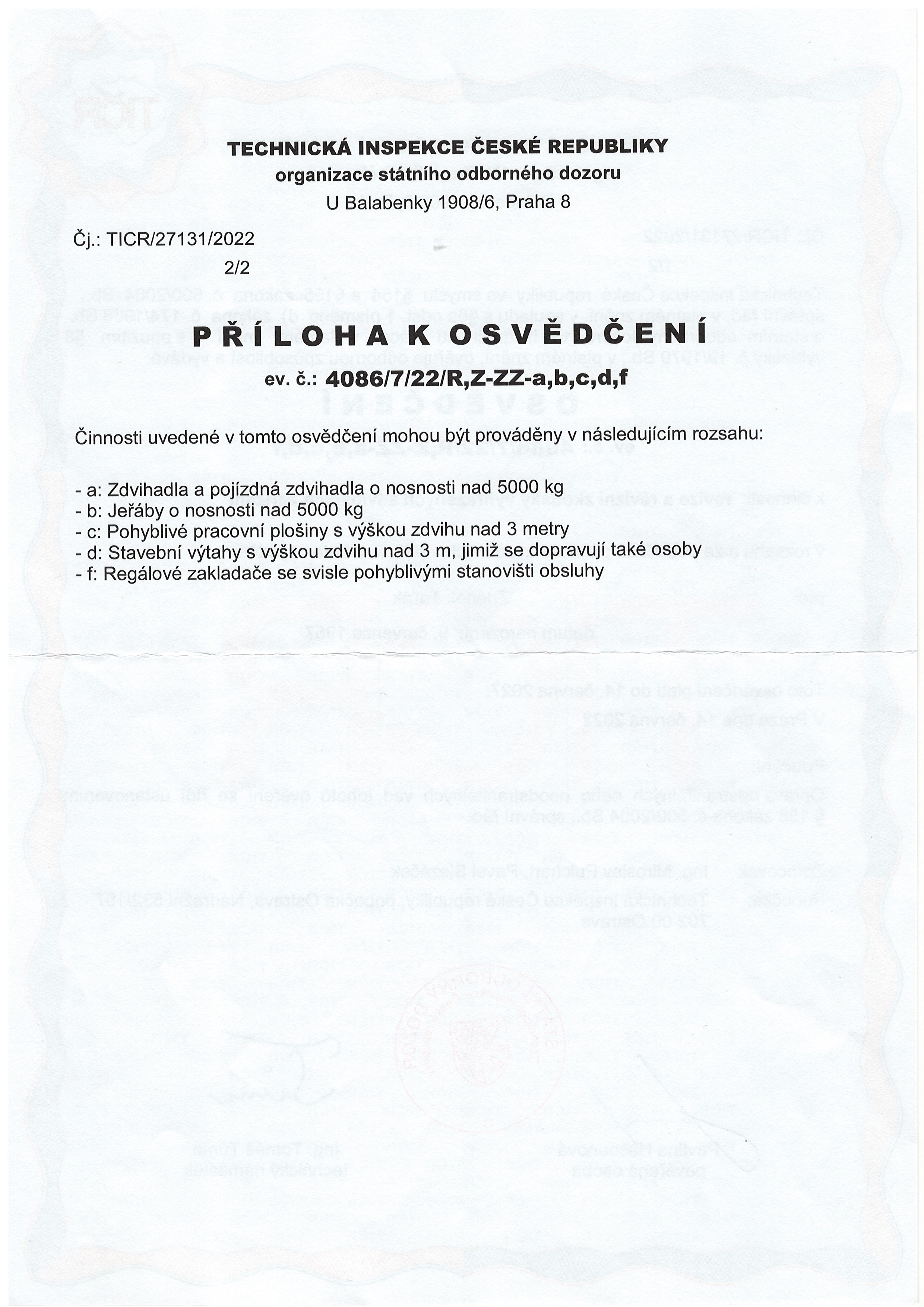 Certifikace dodavatelů + zaměstnanců/Certifikace revize ZZ, školení - Taťák/Oprávnění k montážín, revizím, atd/OPRÁVNĚNÍ k montážím, opravám, revizím a zkouškám ZZ 2.strana.jpg